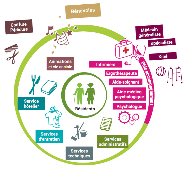 Une équipe pluridisciplinaire, composée de professionnels investis et complémentaires, est à l’écoute des résidents pour les accompagner au quotidien dans le respect de leur projet de vie, de leur autonomie et de leur dignité. Ce pôle d’accompagnement regroupe infirmiers, aides-soignants, aide médico-psychologique, psychologue, ergothérapeute, ainsi que des intervenants extérieurs tels que le médecin généraliste, des spécialistes, des kinésithérapeutes et des praticiens en soins de confort (coiffure, pédicure).